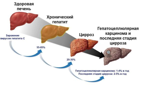 Хроническая форма гепатита С приводит к повреждениям печени разной степени тяжести, а в финальной стадии может вызывать злокачественную трансформацию клеток (рак печени).