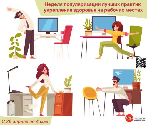 - Проведение коротких 5–7 минутных пауз для физической активности в течение рабочего дня может стать первым шагом на пути к улучшению общего физического состояния как отдельного сотрудника, так и всего коллектива. Упражнения, которые можно легко внедрить на рабочем месте можно подобрать. Активные перемещения!