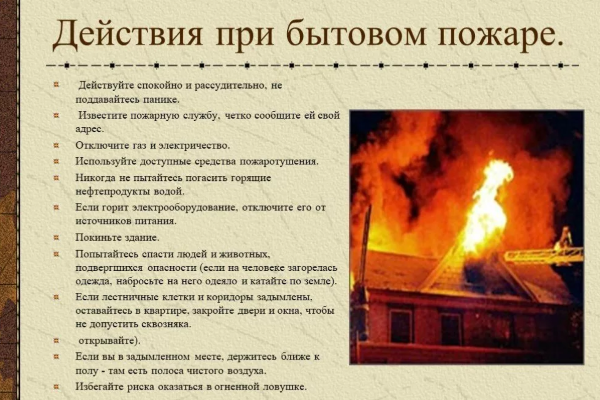 1.Необходимо немедленно вызвать пожарную охрану по телефону «01», сообщив свой точный адрес, объект пожара и встретить пожарную охрану. Детям — если рядом есть взрослые, сразу позвать их на помощь;