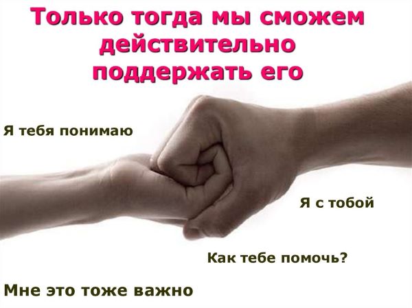 - Установите заботливые взаимоотношения. вы можете сделать гигантский шаг вперед, если станете на позицию уверенного принятия отчаявшегося человека. В дальнейшем очень многое зависит от качества ваших взаимоотношений. Их следует выражать не только словами, но и невербальной эмпатией; в этих обстоятельствах уместнее не морализирование, а поддержка.