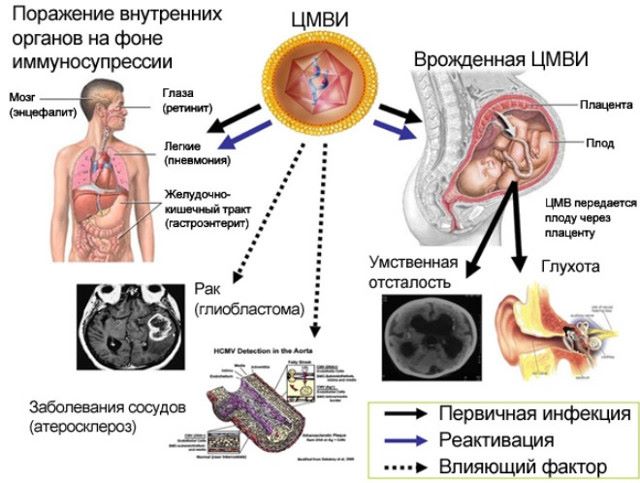 Цитомегаловирусная инфекция может вызывать различные осложнения, особенно у людей с ослабленной иммунной системой. Наиболее частые случаи осложнений включают локальные воспаления органов и соответствующие диагнозы: